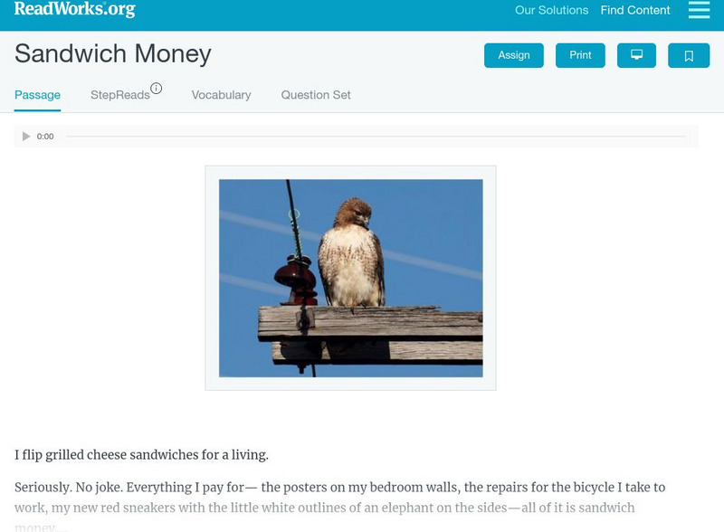 [Free Registration/Login Required] The literary passage "Sandwich Money" features a young woman who works at a restaurant and lives on a tight budget, but splurges to free a bird. A Step Read, an easier version of the story, is provided...