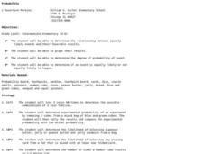 Young scholars complete various activities for probability. In this probability lesson, students use coins, cubes, peanut butter and jelly, playing cards, number cubes, darts, and a Gauss Curve to study probability. Young scholars must...