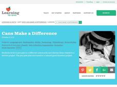 Students design a service-learning project with pen pals. In this philanthropy lesson, students research various charitable organizations with a pen pal and collect cans in order to get money for a donation. Students write to their pen...