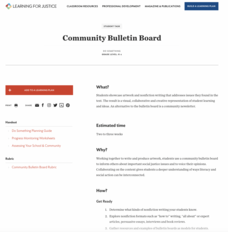 A project-based lesson has pupils create a bulletin board to share artwork, nonfiction articles, and messages based on social justice themes. The finished board is displayed in the community to create a place for discussion.