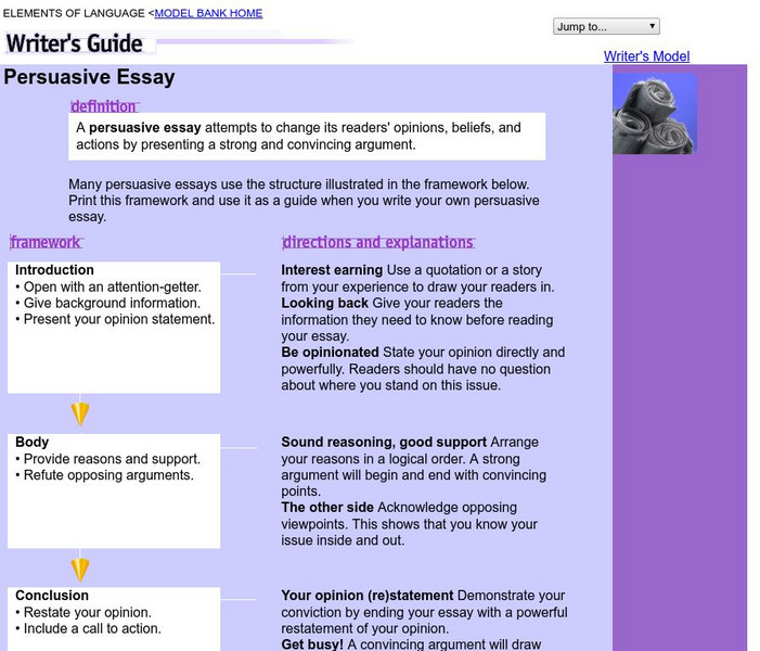 Follow the framework on this page to construct a persuasive essay on any topic. Click on Writer's Model in the upper right to see a Shockwave presentation highlighting how to use the suggestions. W.9-10.10 Write Routinely