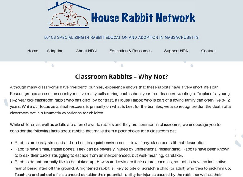 Although this site lists a number of reasons why rabbits in the classroom are not a good idea, there are many informative facts on this site that will educate all interested parties on the care and needs of rabbits.