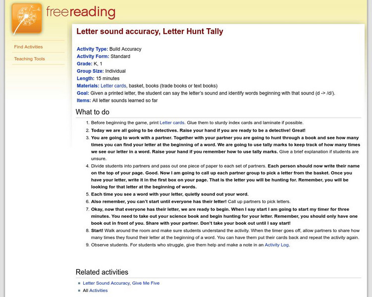Students play detective and discover a given letter at the beginning of a word. They keep a "tally" sheet and compete with their classmates. This site includes links to Letter cards and a Letter Hunt Tally Sheet.