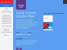Learners recognize long vowel sounds by reading and listening to a story that highlights words with long vowel sounds. They then construct an original story. They use picture clues to aid comprehension, and match words with similar vowel...