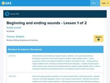 First graders practice the beginning and ending sounds of words. In this phonological awareness instructional activity, 1st graders use picture cards for one syllable words and pronounce each word. Students match other picture cards with...