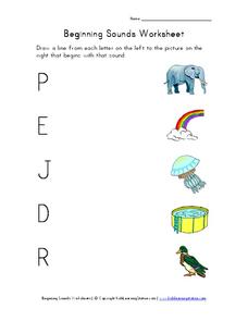 For this beginning sounds worksheet, students draw a line from each letter on the left to the picture on the right that begins with that sounds. The students are given 5 letters and pictures to practice the skill.