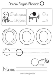 In this recognizing the short "o" sound worksheet, students read the picture words octopus and on, trace and print them, and trace and print the upper case "O" and the lower case "o". Students print 12 answers.