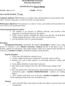 Students create a photo essay and present it to the class. The students bring photos to use for their essay and develop a story using the photos. The students write captions including characters, setting, and plot for each photo. They...