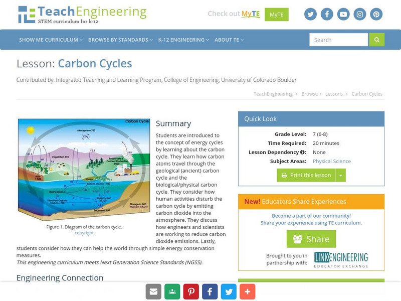 Middle schoolers are introduced to the concept of energy cycles by learning about the carbon cycle. They will learn how carbon atoms travel through the geological (ancient) carbon cycle and the biological/physical carbon cycle. Students...