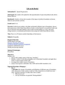 High schoolers discuss different types of boundaries. They research the United States/Mexico border and answer questions about their findings. They create collages, posters, or multimedia presentations showcasing various areas of concern...