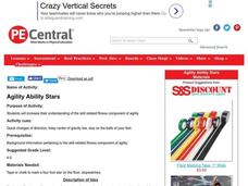 Students practice agility moves timing various locomotor skills (slide shuffle, sprinting, backwards jogging, fast walking), over a star pattern in pairs.