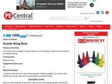 Students use arm muscle strength to perform a partner activity. In this strength building activity, students work with a partner to create a "boat" with mats and a scooter. Partners take turns being pulled or pulling the scooter boat.