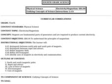 Fourth graders explore magnets as fundamental parts of generators and how they are used to produce current electricity. They distinguish between the north and south pole of magnets and the difference between repel and attract. Students...
