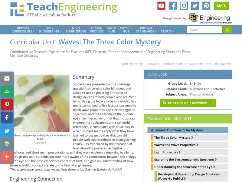 Students are presented with a challenge question concerning color blindness and asked to use engineering principles to design devices to help people who are color blind. Using the legacy cycle as a model, this unit is comprised of five...