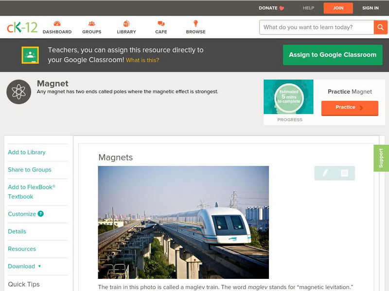 A module that uses pictures, videos, reading passages, and review question to go over what a magnet and magnetic pole are, and how magnetic force is related to magnetic field. This site may require free registration to access all...