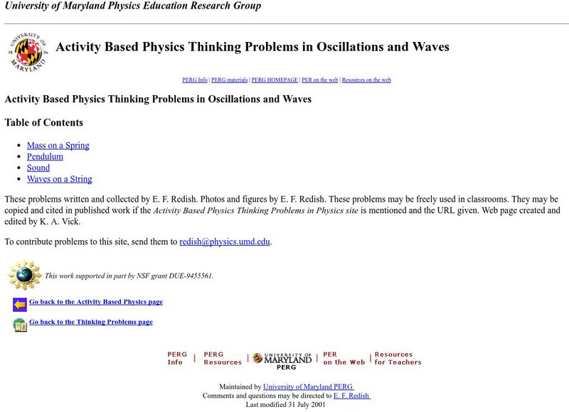 A series of thought-provoking, multichoice questions from the University of Maryland on the topic of oscillations and waves. Equations for calculating the period of motion for masses on springs, pendulums, sounds, and waves on a string...
