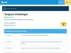 Students explore geometric concepts by working with Tangram Puzzles. In this Tangram challenge lesson, students use problem-solving tasks that involve physical manipulatives. Students select a picture and use all seven pieces...