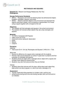 Students identify two dimensional shapes in the school environment. In this basic shapes lesson, students watch a video about rectangles and squares. Students find examples shapes in their classroom and draw them. Students present their...