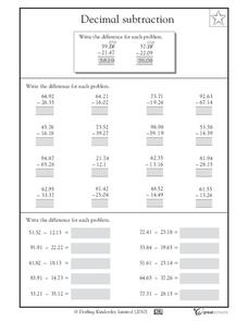 How well can your fifth graders work with decimals? What about subtracting decimals? Use this resource to practice these important skills. Sixteen problems help pupils subtract decimals to the hundredths place, while 10 problems at the...