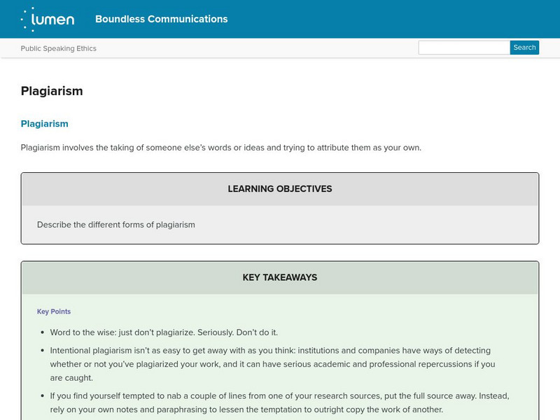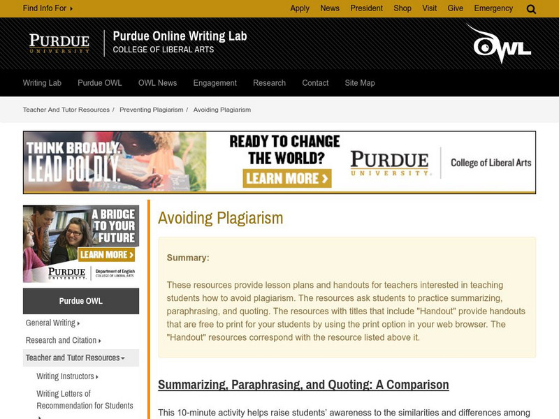 This lesson focuses on understanding and avoiding plagiarism by properly paraphrasing, using quotes when appropriate, using in-text citatation, and a Works Cited Page. It provides links to a plagiarism discussion rubric and the...