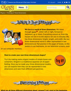 Discover different dimensions with paper folding. Pupils first read about zero, one, two, and three dimensions, and then learn about the fourth dimension, time. They then use origami to create models of shapes in three dimensions and use...