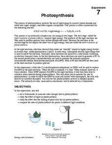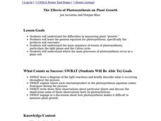 Students conduct experiments with plants. In this photosynthesis lesson, students examine plants under different types of lights. They calculate the amount of dissolved ocygen concentration and compare it to the formula for...