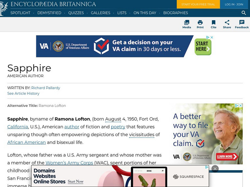 This entry from Encyclopedia Britannica features Sapphire, an American author of fiction and poetry that features unsparing though often empowering depictions of the vicissitudes of African American and bisexual life.