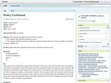 Eleventh graders identify the structure, rhythm and style of a selected poem, experience utilizing poetic devices and analyze an annotated poem. They evaluate the themes and inferred meanings to a variety of poems from their textbooks.
