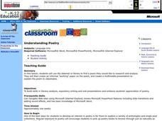 Learners research a poem using the Internet or library source. They analyze their selection including a line by line explanation of the poem. Students create a powerpoint presentation of their analysis.