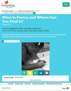 Learners examine different types of poetry in music, commercials and printed works. They identify themes of philanthropy in poetry as well. They finally share their findings with the class.