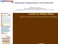 In this poetry and listening skills online learning exercise, students watch a YouTube video reading of the poem, "London" by William Blake. They enter the correct words in a cloze activity. They read an excerpt about the poem and answer...