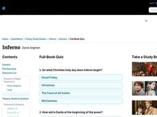 For this online interactive reading comprehension worksheet, students respond to 25 multiple choice questions about Dante's Inferno. Students may submit their answers to be scored.