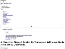 In this online interactive reading comprehension worksheet, learners respond to 18 short answer and essay questions based on Williams's A Streetcar Named Desire. Students may also access an online quiz on the selection using the...