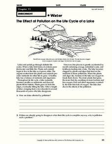 In this water worksheet, students read an excerpt about the effects of pollution on the life cycle of a lake. Then they describe how lakes are affected by the pollution. Students also define why pollution has become such a problem for...