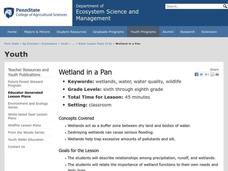 Students discover how wetlands filter out contaminants before they can reach other bodies of water. In groups, they design and build a model of a stormwater wetland. They test the water quality and inform their classmates about the...