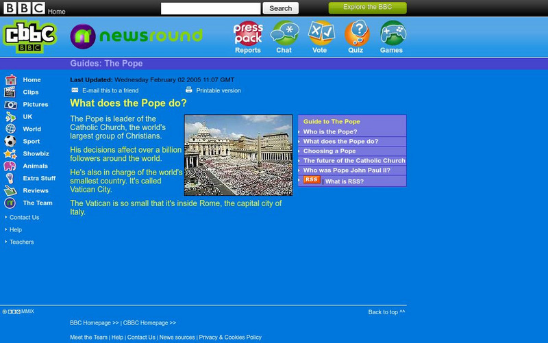 Learn more about who the Pope is and what he does through this informational website. Also includes information on how the Pope is chosen and a brief biography of Pope John Paul II.