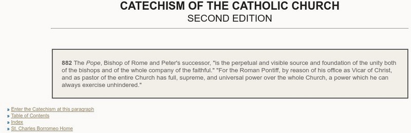 This site contains the American Translation of the Roman Catholic Catechism. It contains the exact phrase which explains the Official Church's beliefs in the Pope.