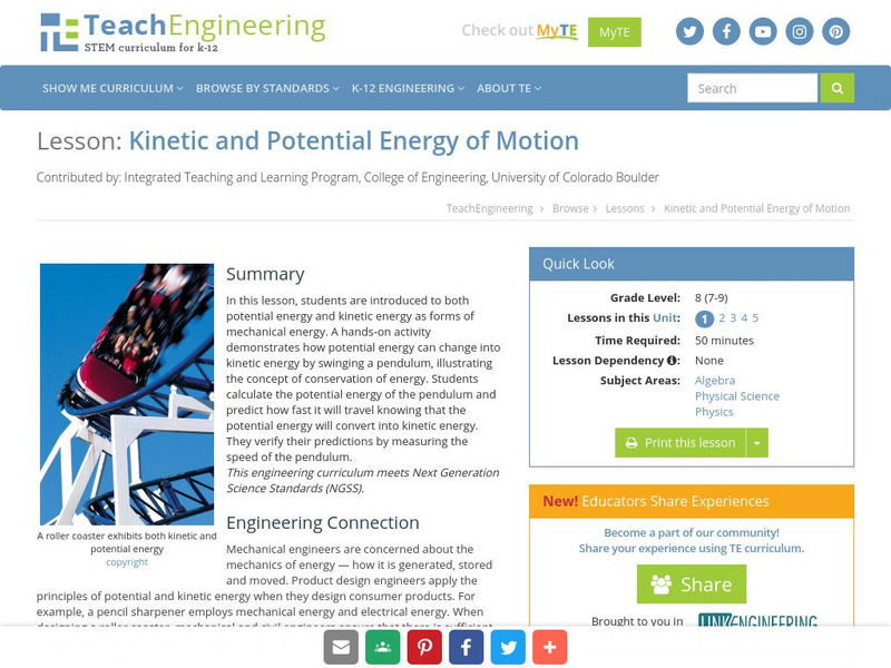Teach Engineering: Kinetic and Potential Energy of Motion