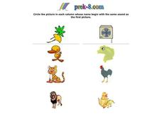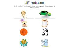 For this consonant sound worksheet, 1st graders focus on the initial letter sounds. Students study 8 pictures and circle those that have the same sound as the first picture on the page.