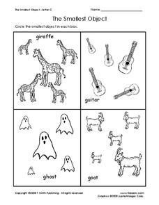 In this alphabet worksheet, learners will focus on the letter g. Coloring pictures that begin with the specific letter sound, students will choose the smallest object in each box to color.