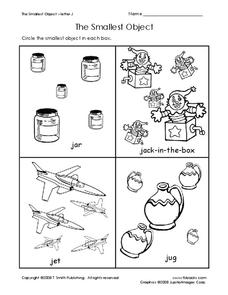 For this alphabet worksheet, students will focus on the letter j. Coloring pictures that begin with the specific letter sound, students will choose the smallest object in each box to color.
