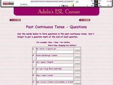 In this online/interactive creating interrogative sentences worksheet, students use groups of words that include the subjects, present tense verbs, and prepositional phrases to create questions with past continuous tense verbs. Students...
