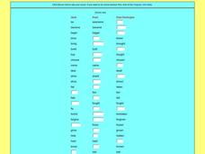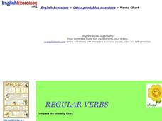 In this regular and irregular verbs worksheet, students complete the present and past tense chart for regular and irregular verbs. Students complete 2 charts.