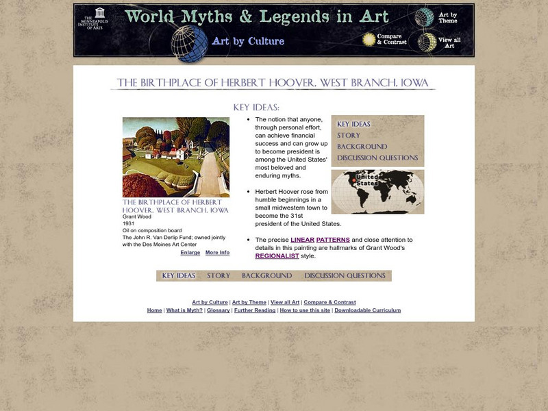 Site features the painting "The Birthplace of Herbert Hoover, West Branch, Iowa" by Grant Wood. The legend behind the painting, background information, and discussion questions are provided. An outline of key ideas and vocabulary...