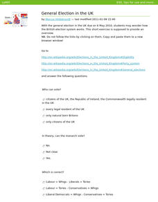 In this United Kingdom election learning exercise, students research the listed Web sites regarding elections in the country and then respond to 9 multiple choice and short answer questions about the selection.