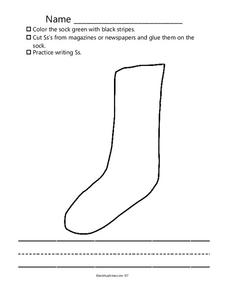 In this letter Ss recognition worksheet, students view a sock, color it with stripes, cut and glue the letters S and s on the sock, and practice printing capital S and lowercase s on a primary paper line. Students complete four activities.