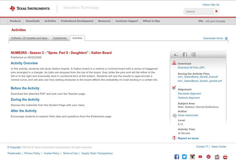 Based off of the hit television show NUMB3RS, this lesson has students find the probability of chips falling into each bin of a Galton Board (also known as a quincunx or Plinko board), and then graphing these data to form a normal curve....