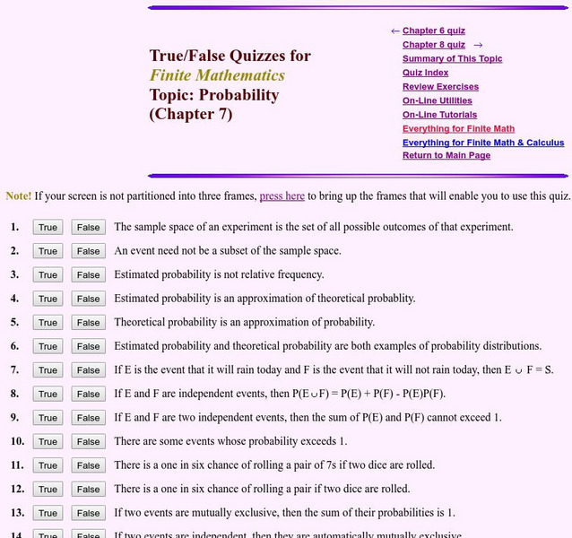 The online quiz assesses student comprehension of math concepts. The quiz consists of true/false questions about probability.