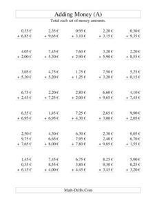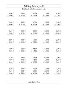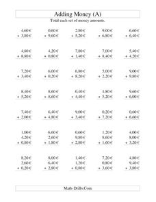 For this money addition worksheet, young scholars use their math skills to solve 20 problems that require them to add together Euro amounts.