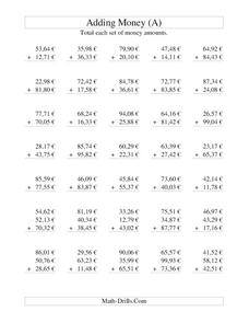 For this money addition worksheet, students use their math skills to solve 20 problems that require them to add together Euro amounts.